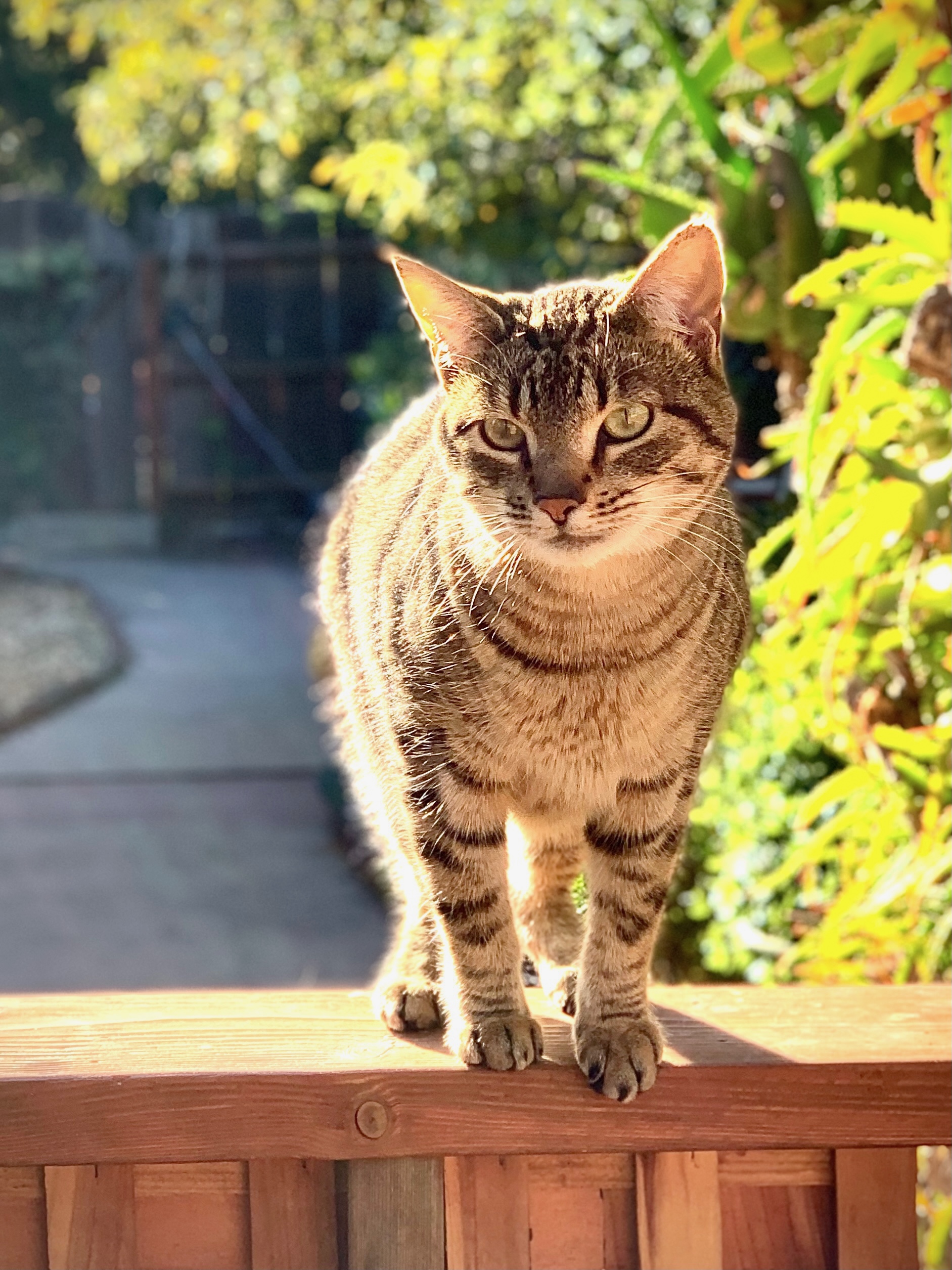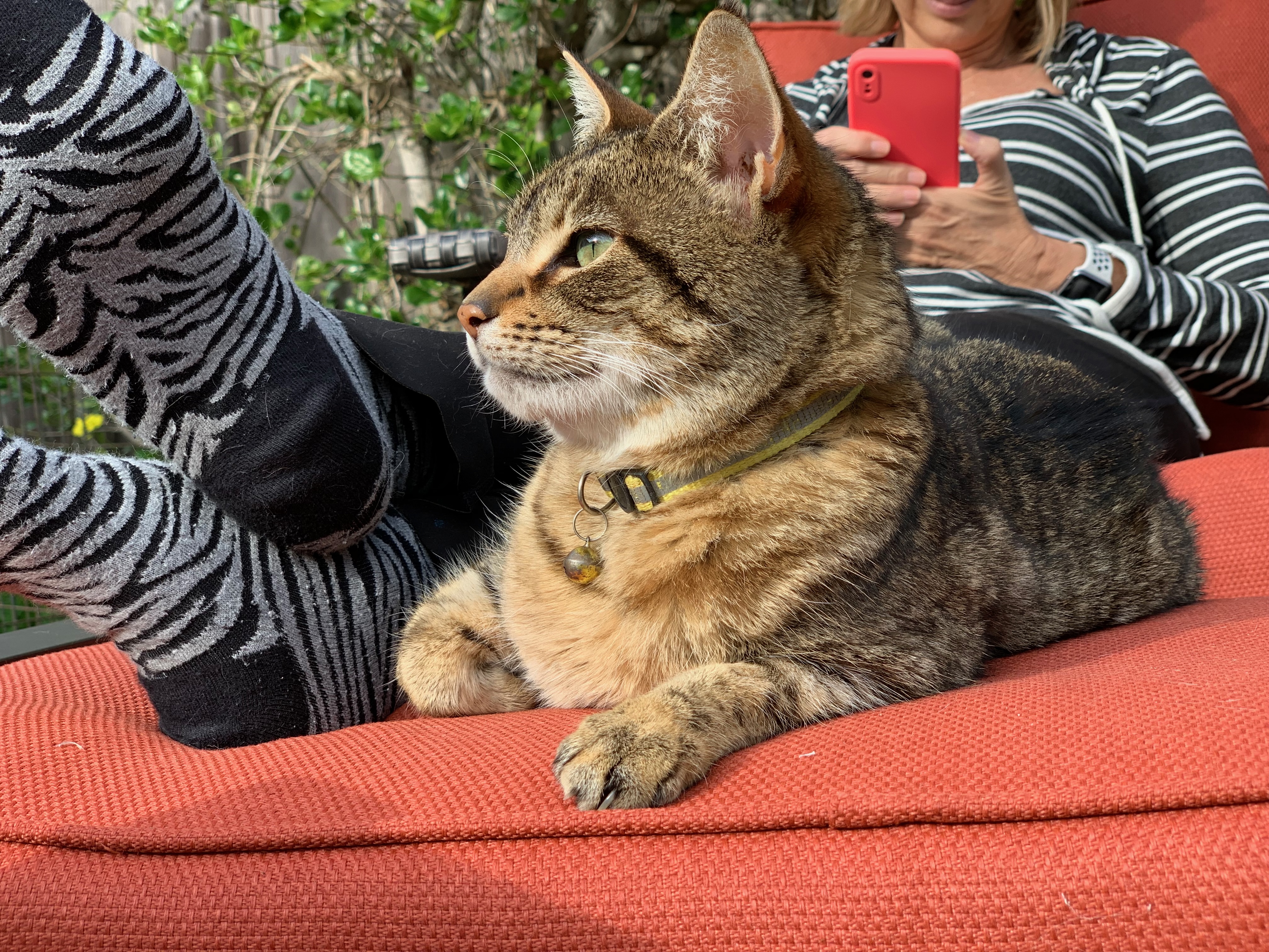 Susan enjoys basking in the sun, receiving neck scratches, and exploring our fenced yard in search of bugs.
